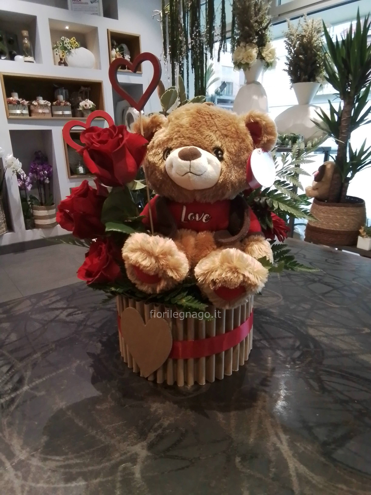 Composizione in scatola di 3 rose rosse e orsacchiotto